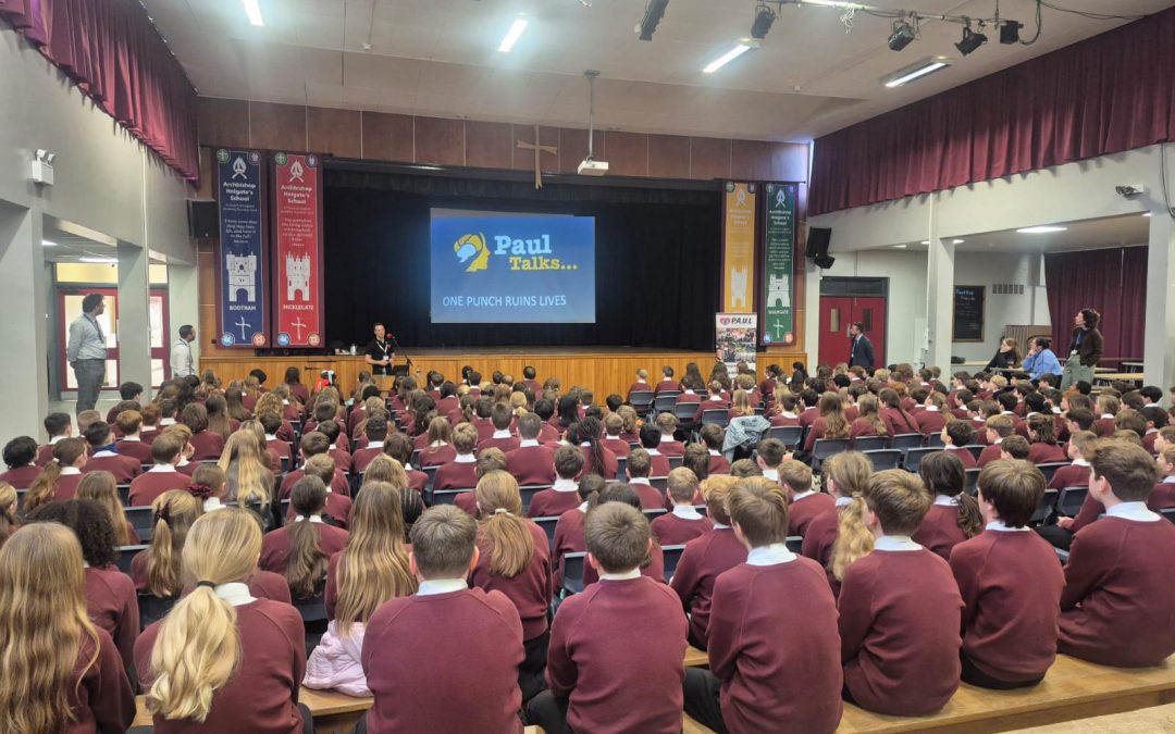 Recently, Paul had the privilege of speaking at Archbishop Holgate’s School in York. It was a personal milestone for him — delivering eight One Punch Ruins Lives talks in one day, reaching 1,900 young people across Years 7–13, including alternative provision and SEND students.